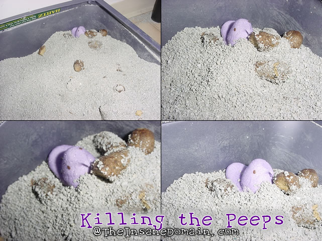 There was some concern that leaving a peep in the kitty litter for any longer than a day might not only lead to it being pissed on, but perhaps sticking to the paw of the cat and being dragged around the place. Not wanting to cause that sort of mess (even though it would be funny), the peep was only left in litter for a day.
