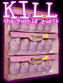Remove their eyes and replace them with those of a cat (Why? Because it'd be cool). Then make a small incision down the front of the purple peep and insert a small nuclear device. Following that, bake in the oven for 10-15 minutes at 200 degrees and await the fireworks. Failing to aquire a nuclear device will not be a problem. You could probably make one... if all of the above seems a bit hard to carry out, mail the purple peep to president Bush including a note to say it's some sort of terrorist explosive, and watch your purple peep appear on television with the bomb and firing squad. It'll probably get mutilated by some dog after that if it's not already blown to bits by a trigger-happy American with a sub machine gun. - Mort.