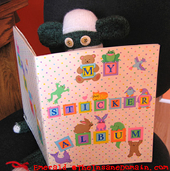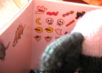 When McDiablo adopted me, she gave me this as a present--her old sticker album! I'm planning on filling up all the pages with my own stickers someday. Since Hallowe'en is one of my favourite holidays, this page of spooky stickers is one of my favourites in the album. |